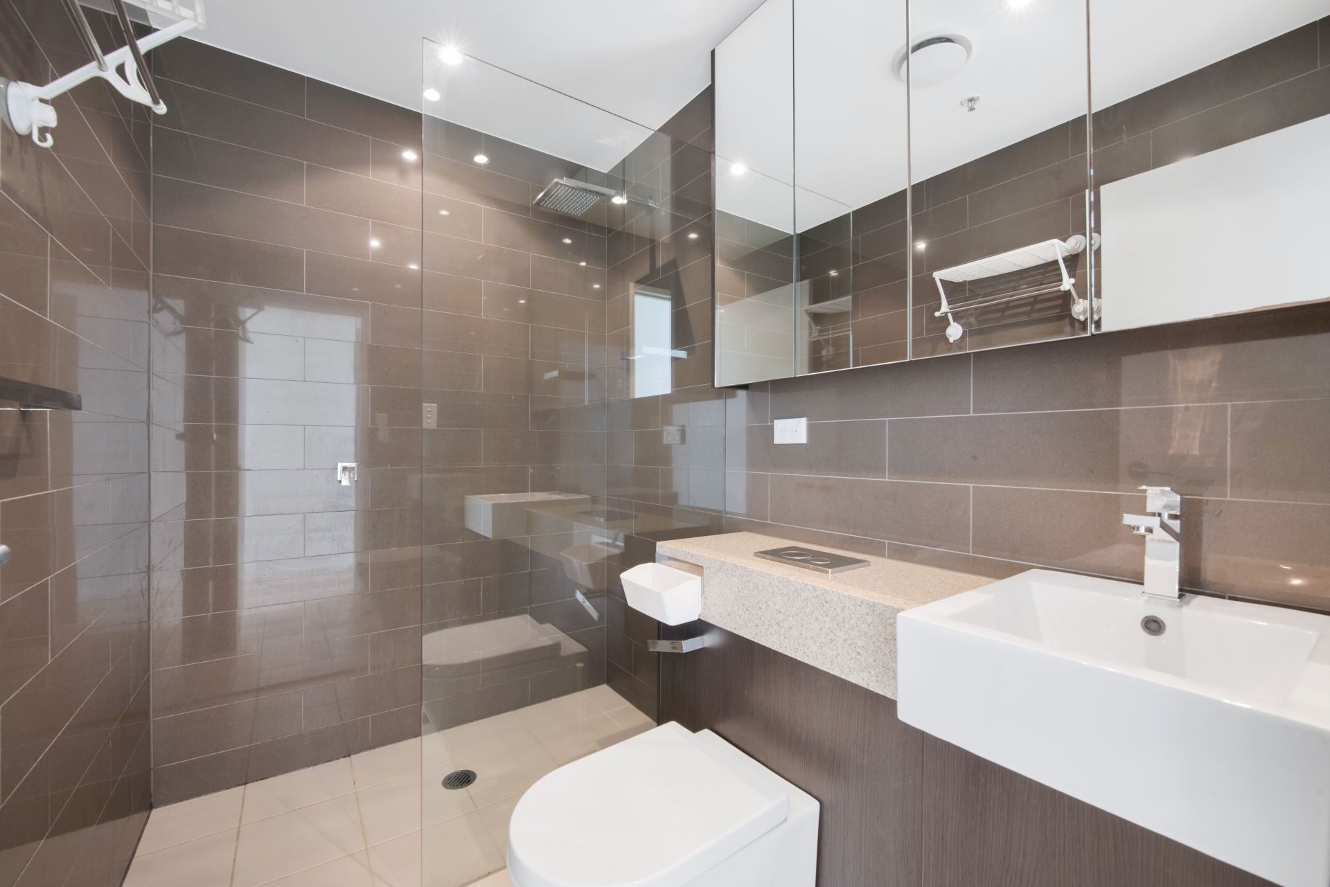The apartment offers two generous bedrooms, each with built-in wardrobes. The master bedroom boasts an ensuite bathroom, while the second bedroom is serviced by a sleek and modern main bathroom. Both bathrooms feature high-quality fixtures and finishes, directly access to the balcony with sufficient sunlight.