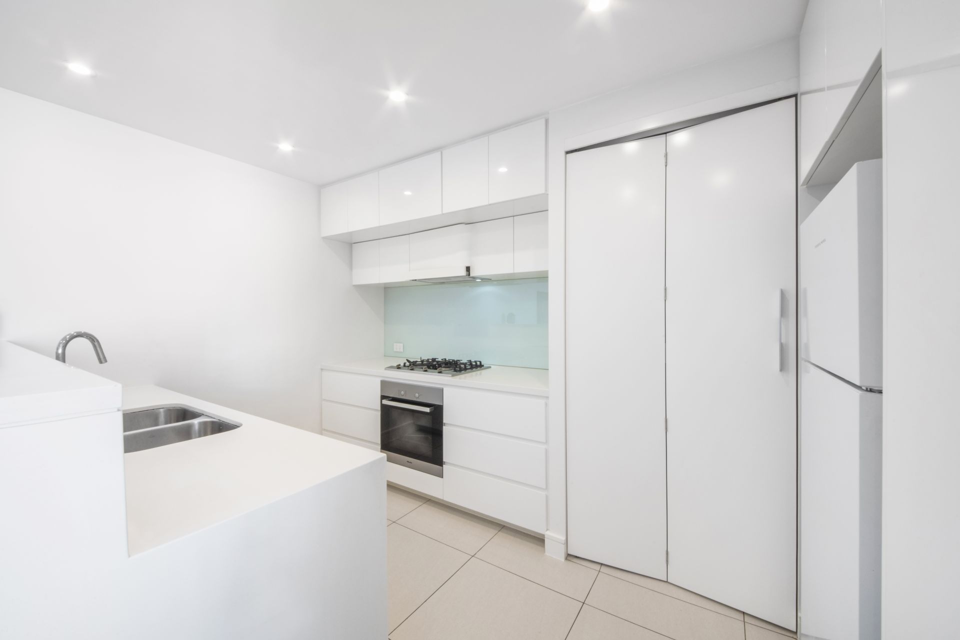 -Sleek stone-topped gas kitchen with quality appliances