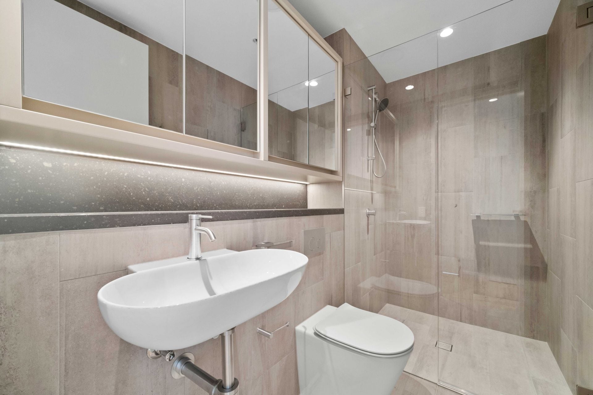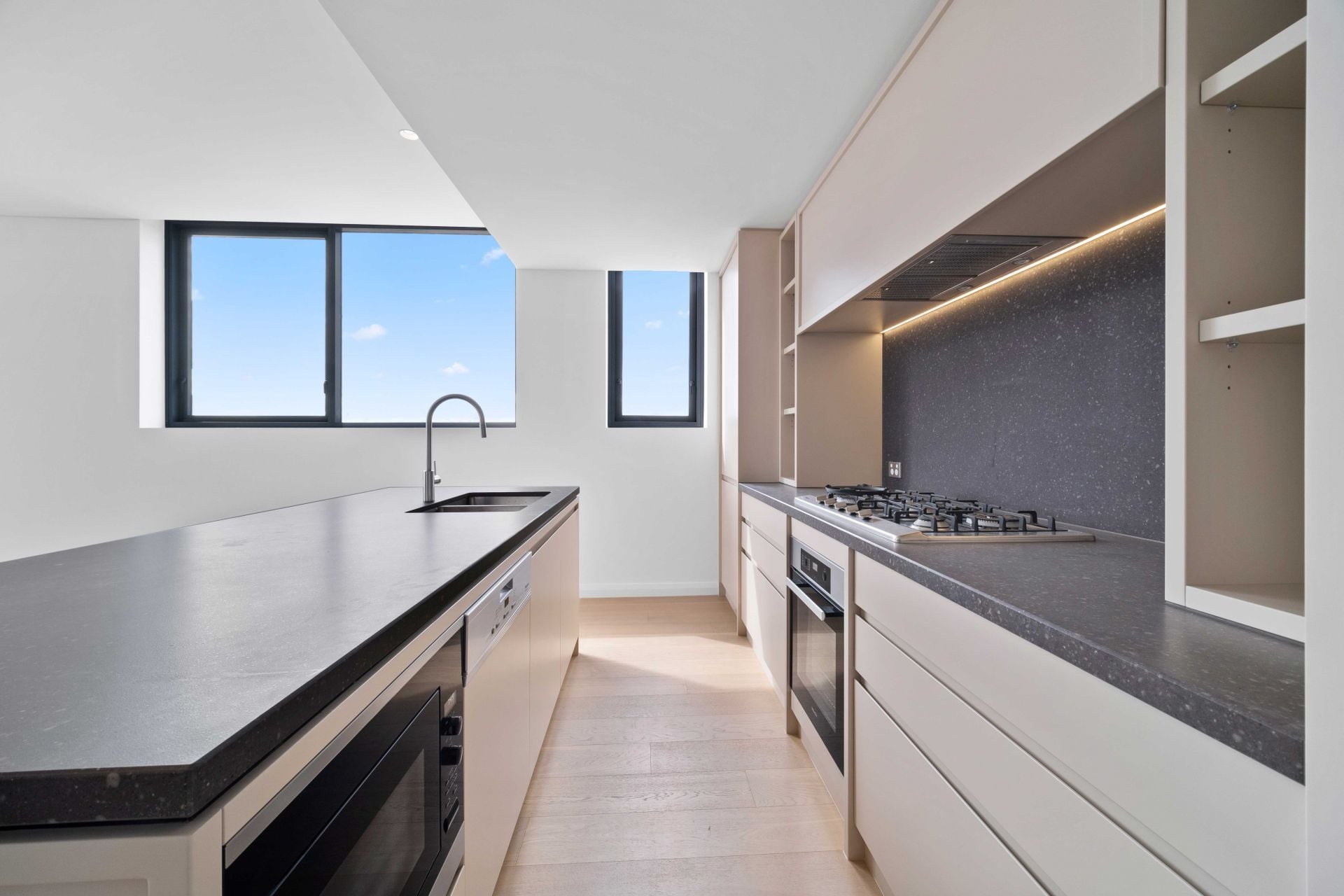 - Modern open-plan kitchen with stone bench top and high quality stainless steel appliances